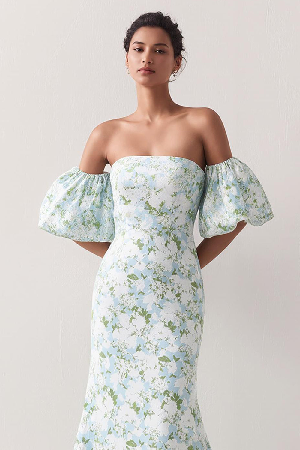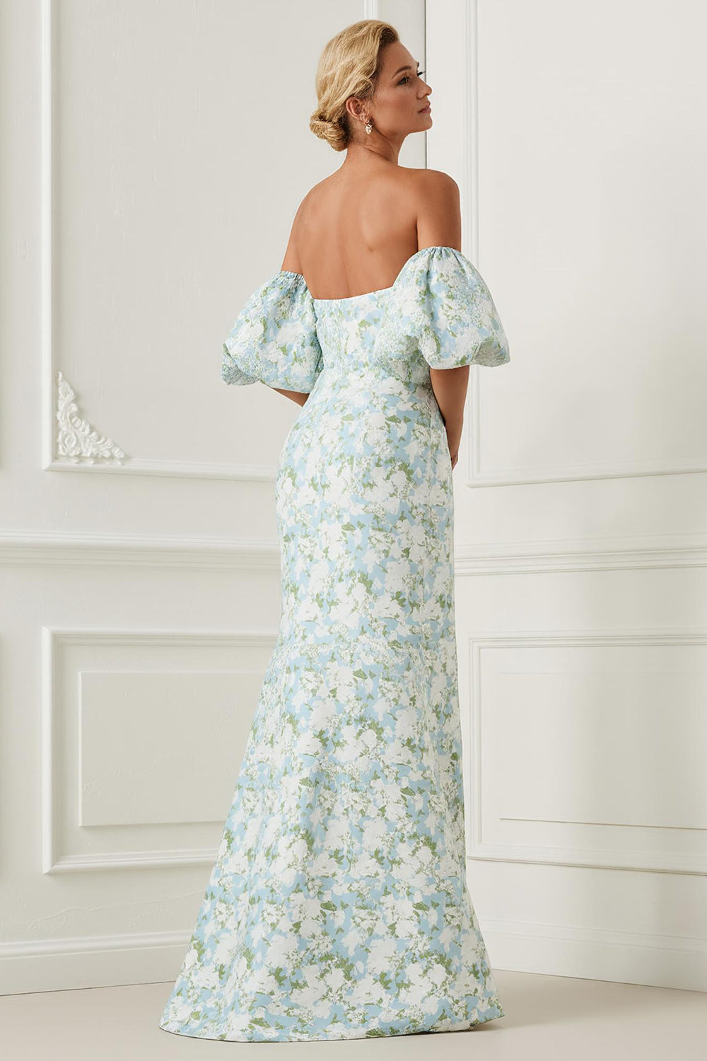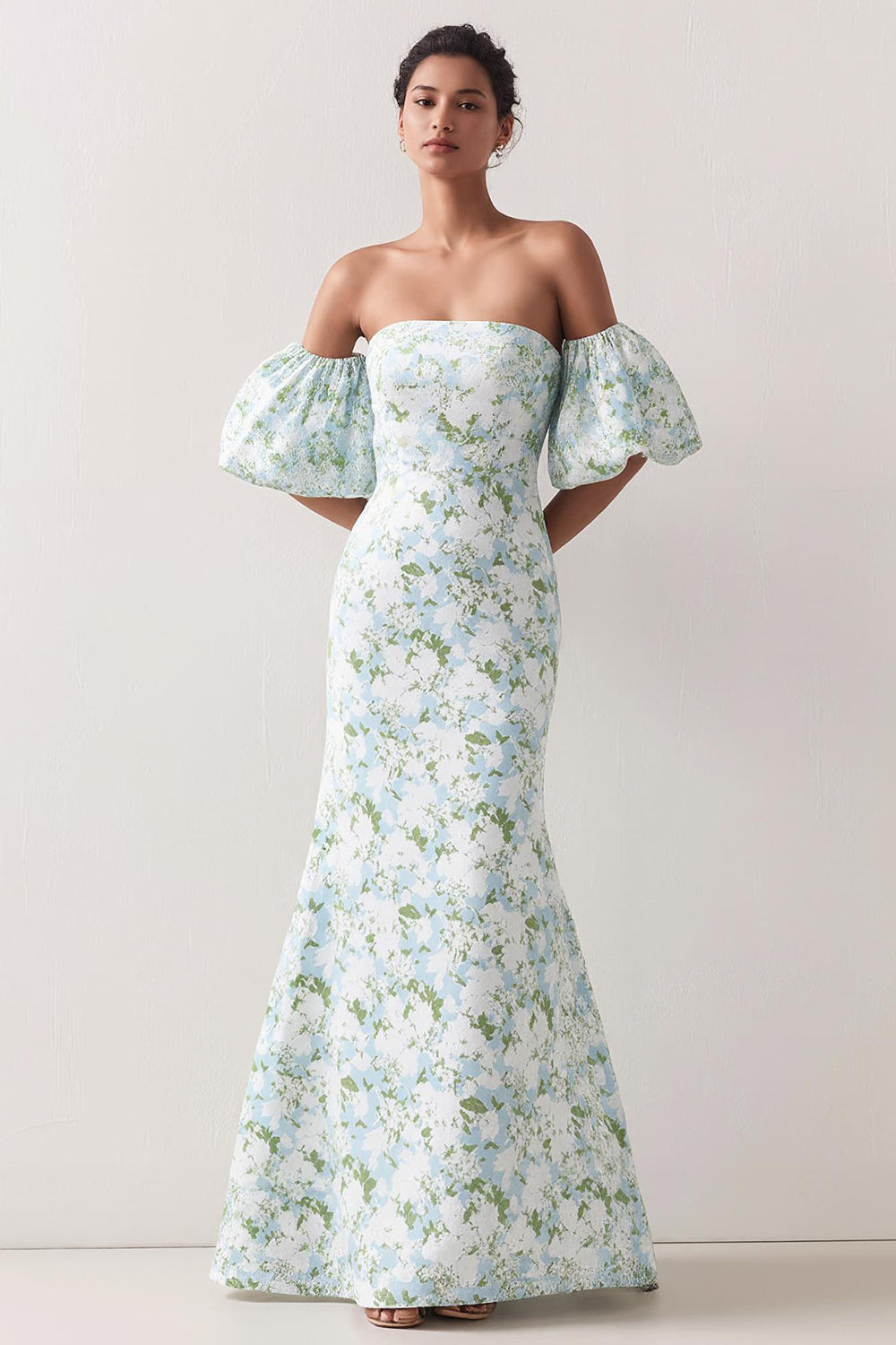 Strapless Blue White Floral Mermaid Prom Dress with Removable Sleeves
