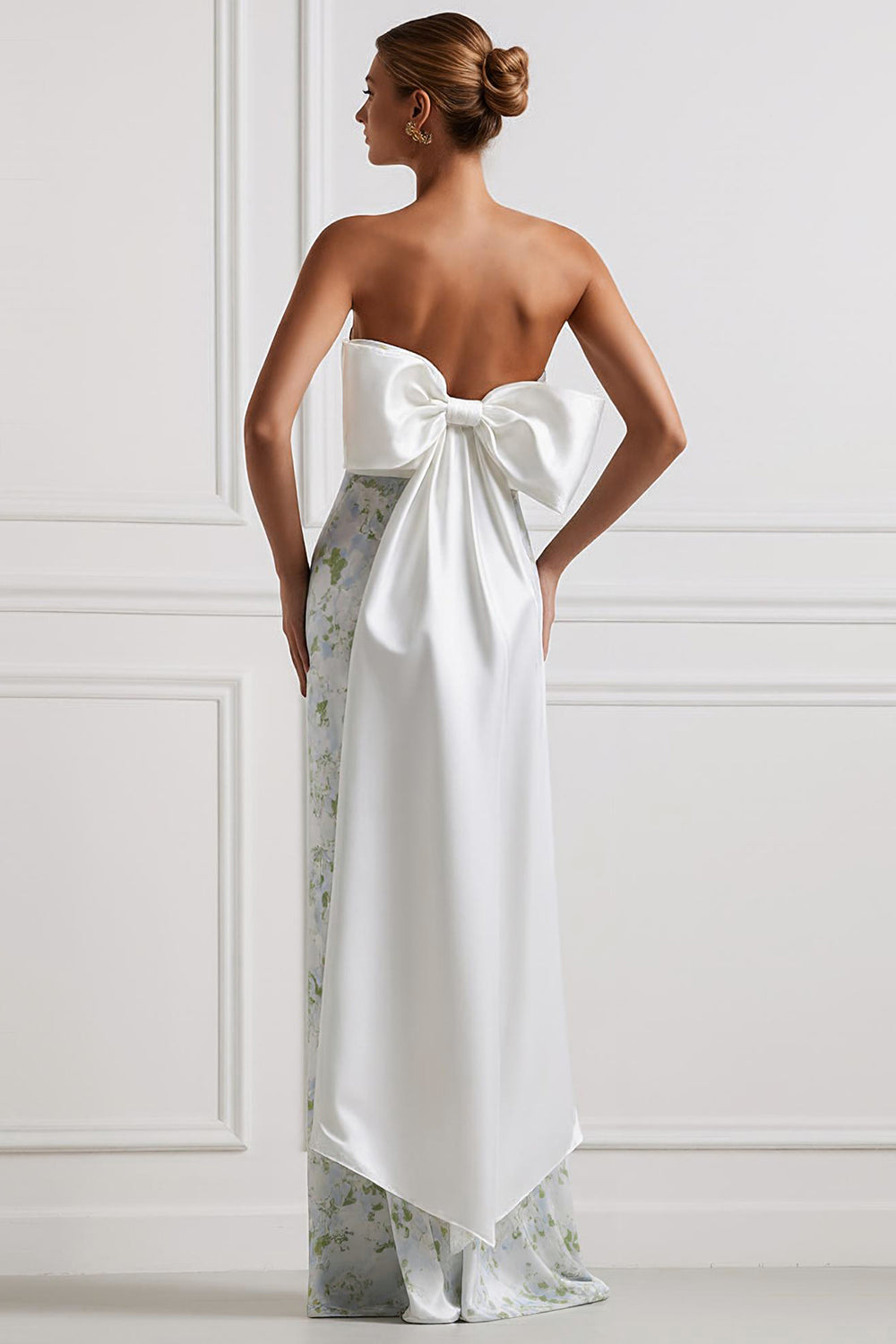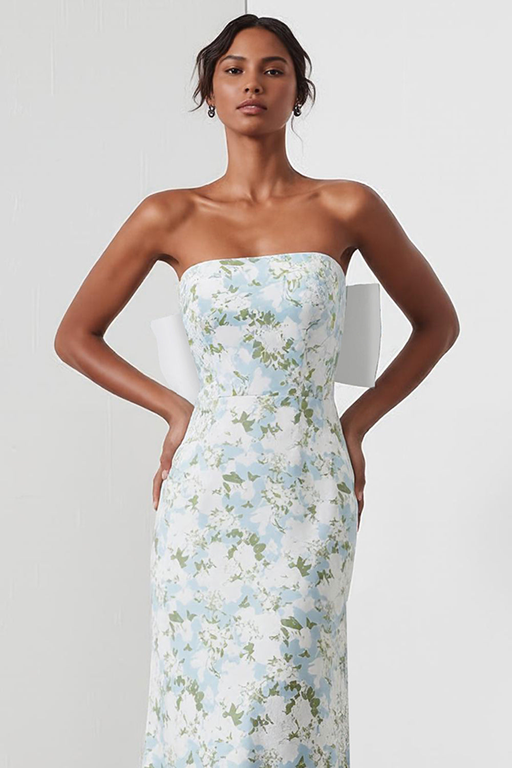 Strapless Blue White Floral Sheath Satin Prom Dress with Back Bow