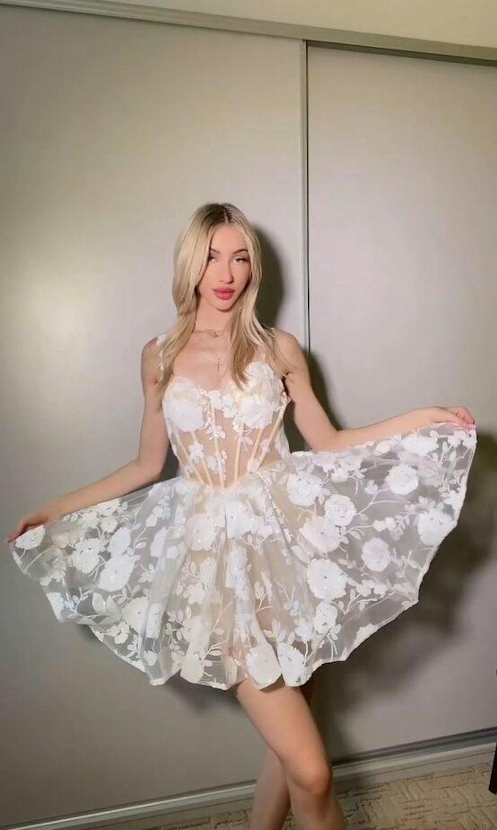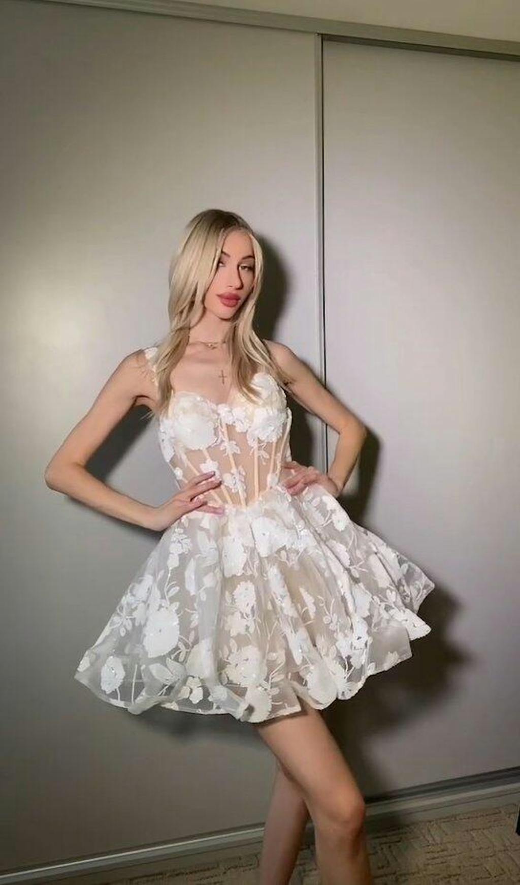 White A-Line Corset Short Floral Prom Dress with Sequins