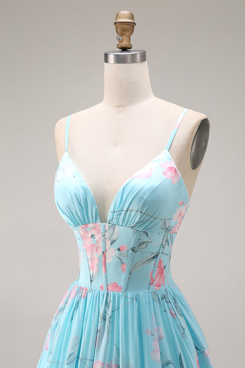 A Line Blue Pink Flower Ruffled Spaghetti Straps Long Prom Dress