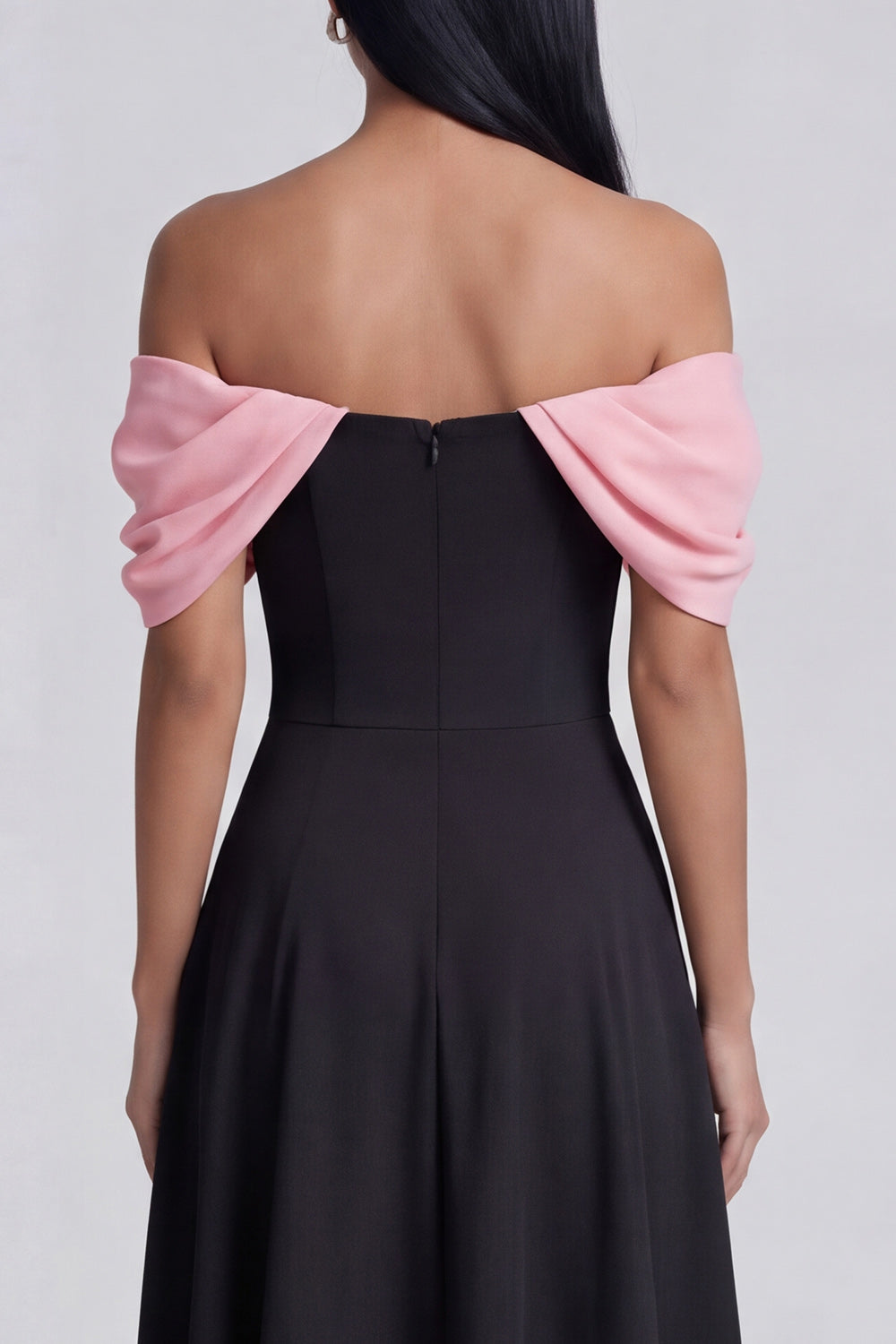 Black Ruched A Line Off The Shoulder Midi Wedding Guest Dress