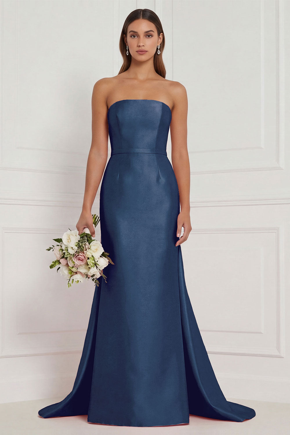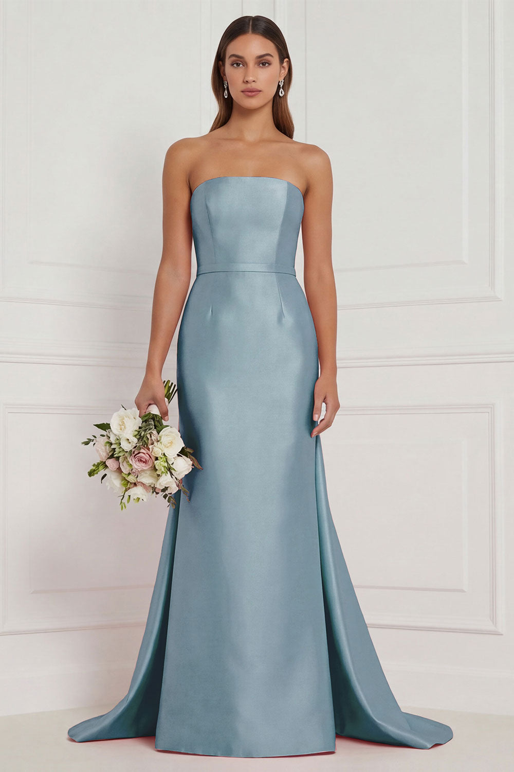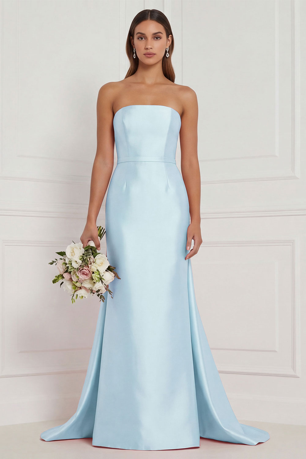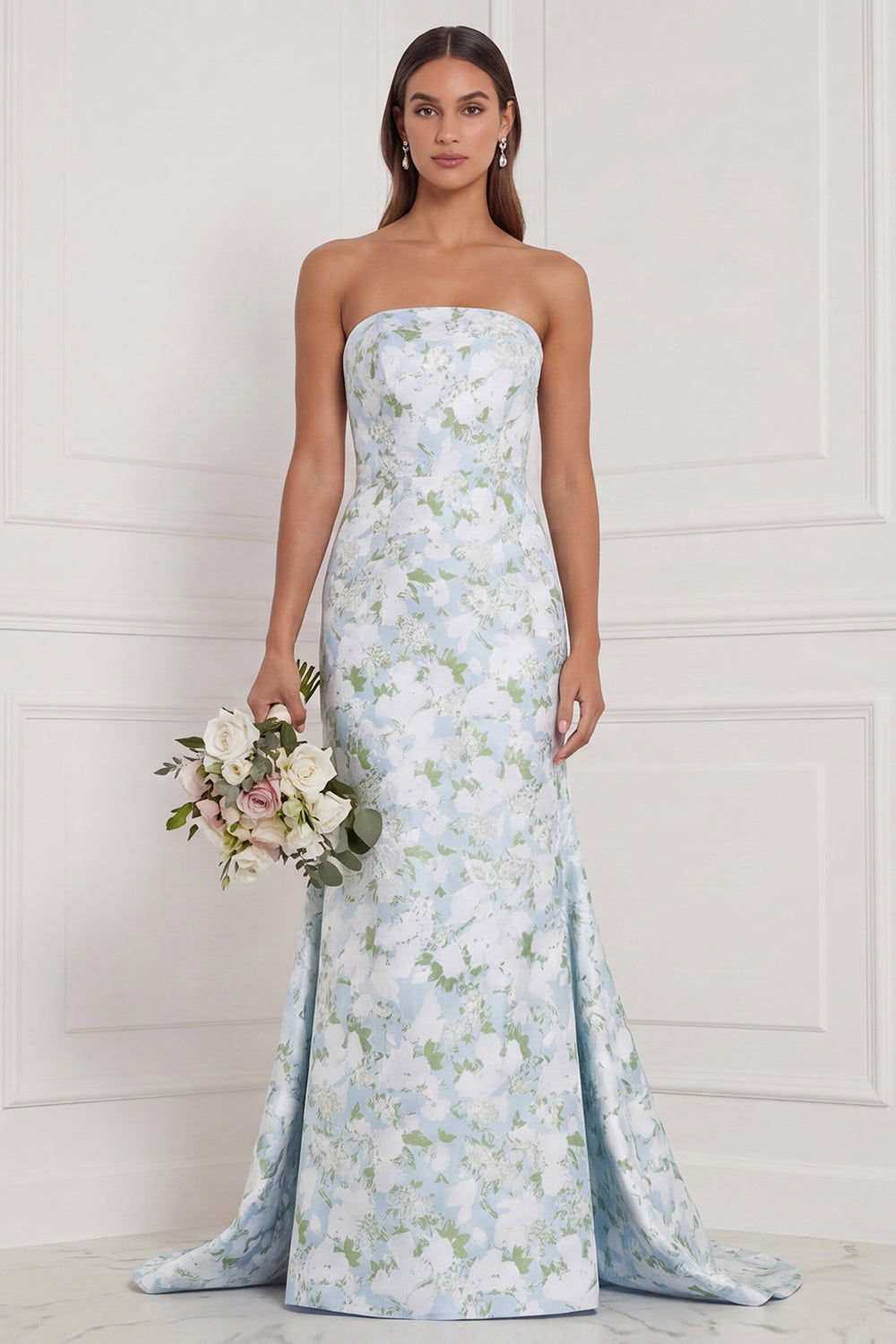 Blue White Flower Strapless Bridesmaid Dress