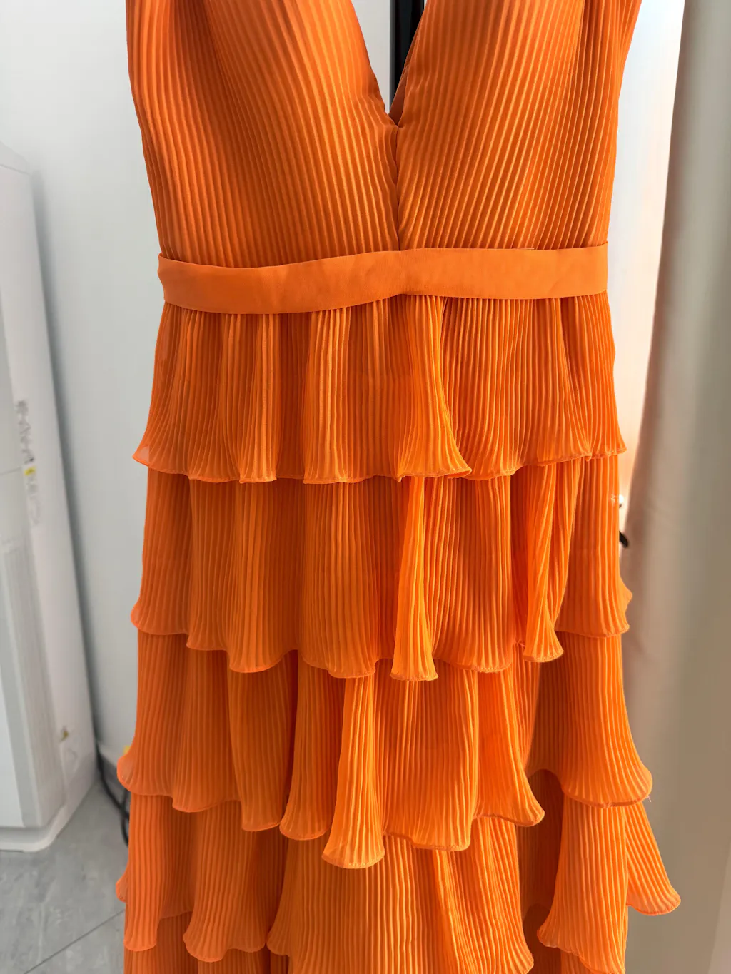 This dress is an ethereal vision of elegance, featuring delicately pleated fabric that cascades into layered ruffles for a flowing, graceful effect. The deep V-neckline and fitted bodice create a flattering silhouette, while the cinched waist enhances the feminine shape. The tiered pleated skirt adds depth and movement, making this gown a stunning choice for any formal occasion.