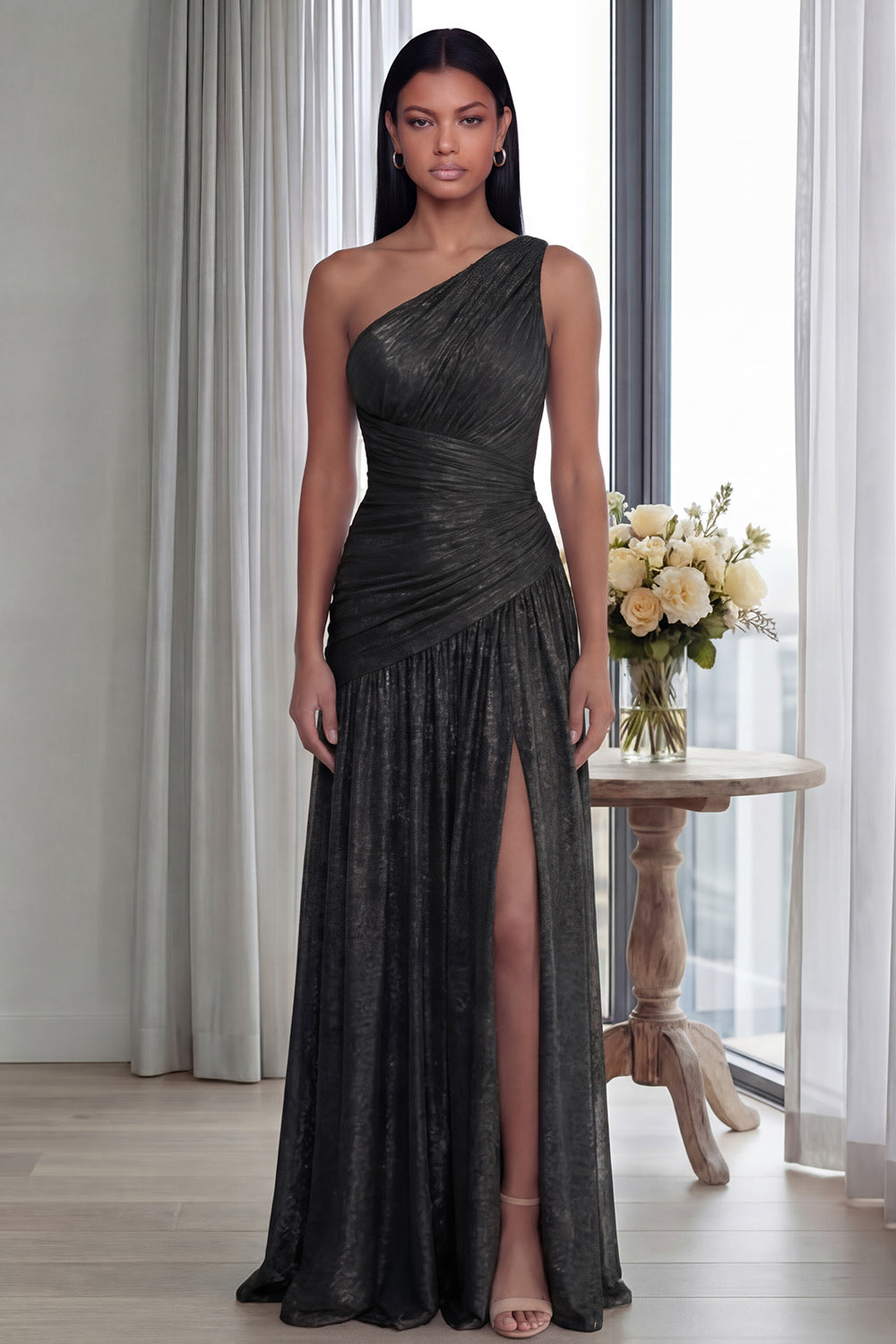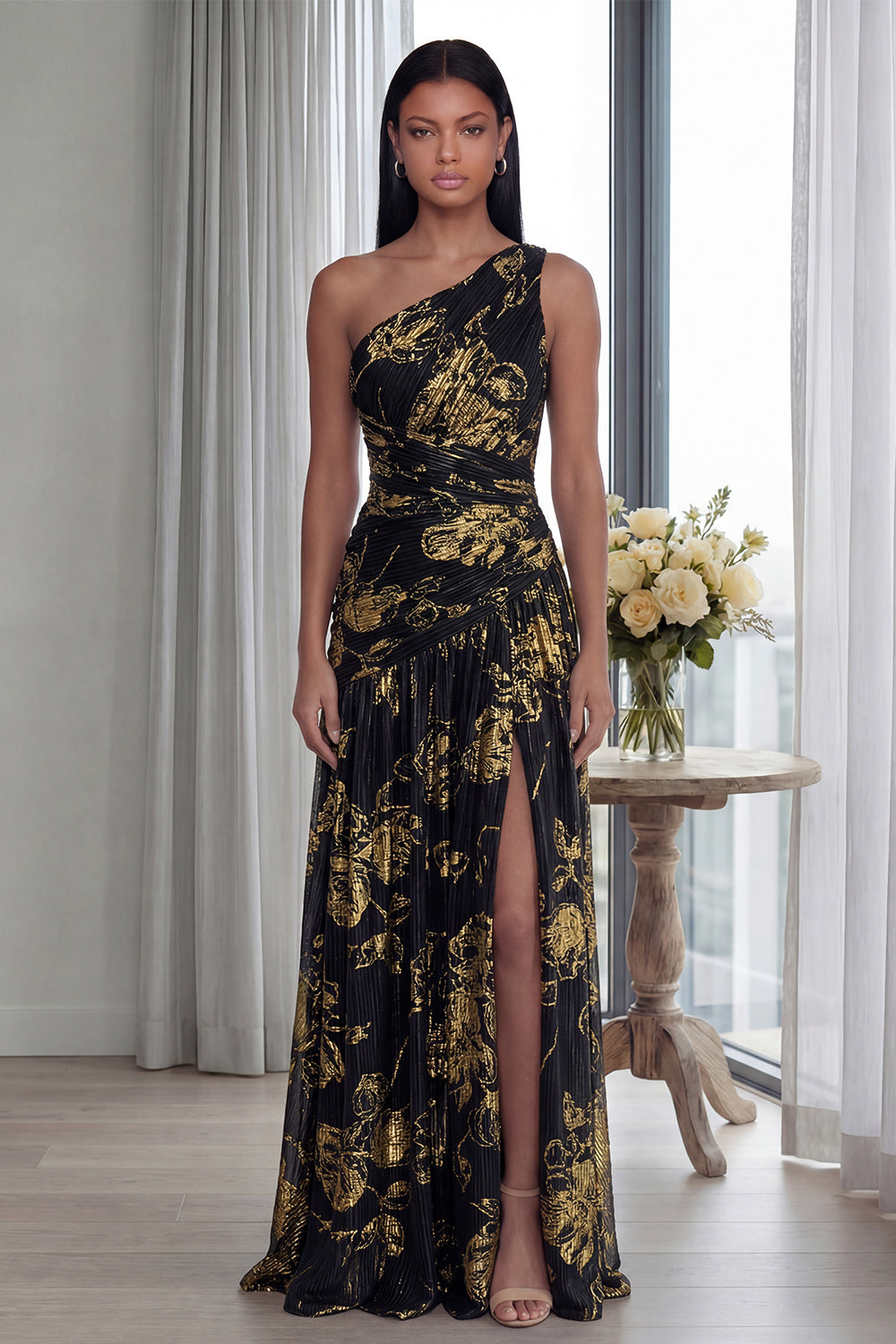 Gold One Shoulder Ruched A Line Evening Dress