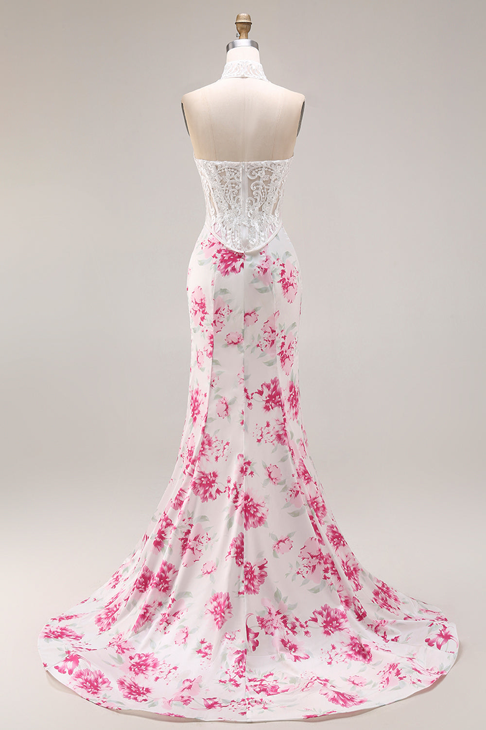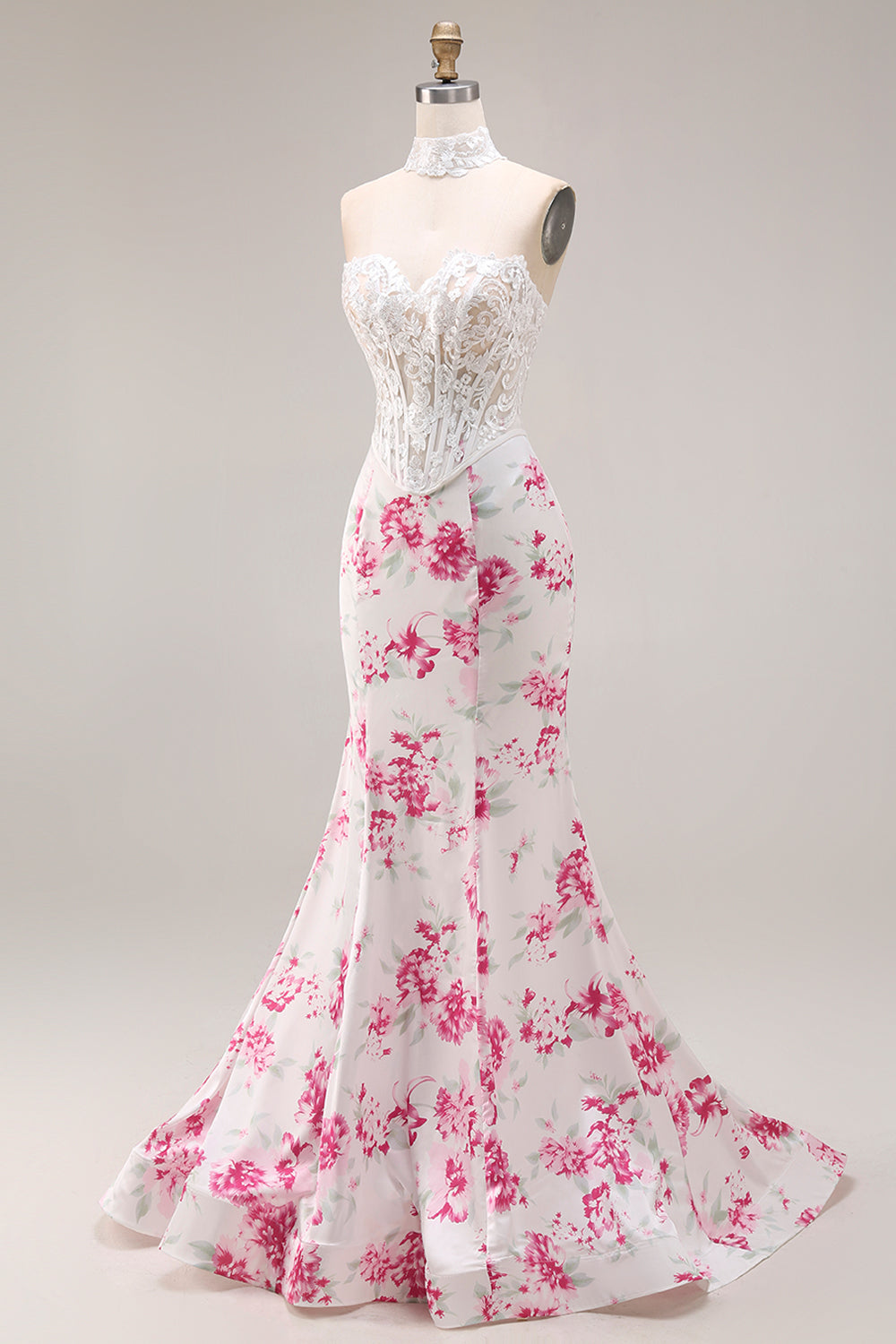 Mermaid White Fuchsia Flower Sweetheart Corset Long Prom Dress with Lace