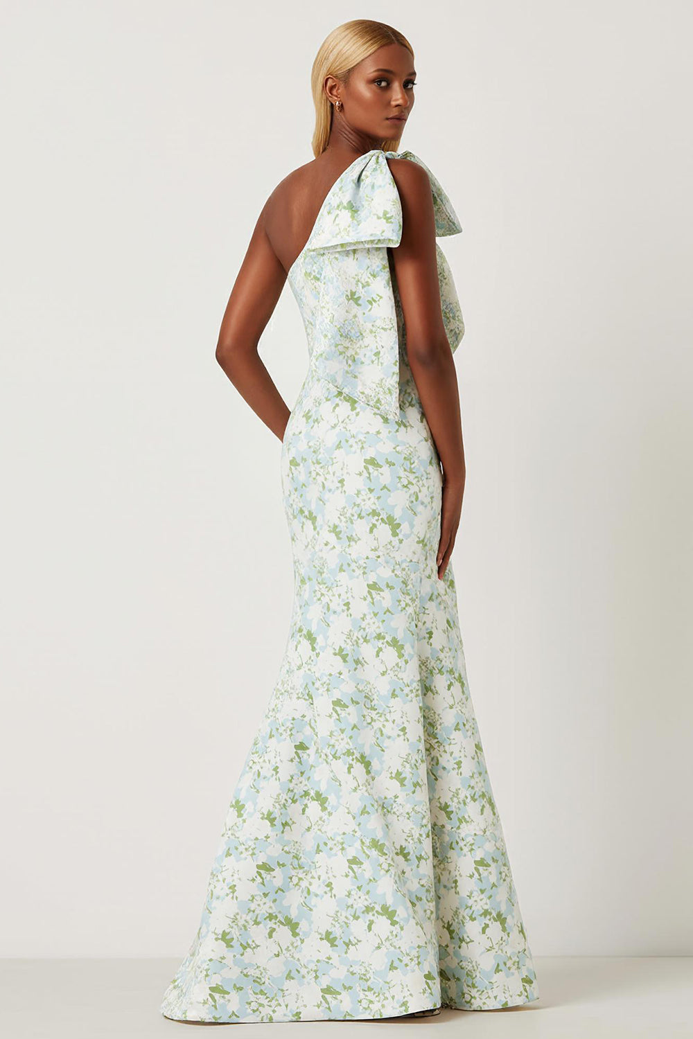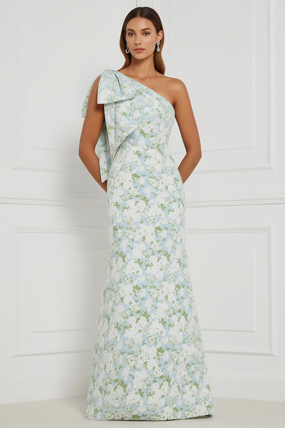 One Shoulder Blue White Floral Printed Mermaid Prom Dress