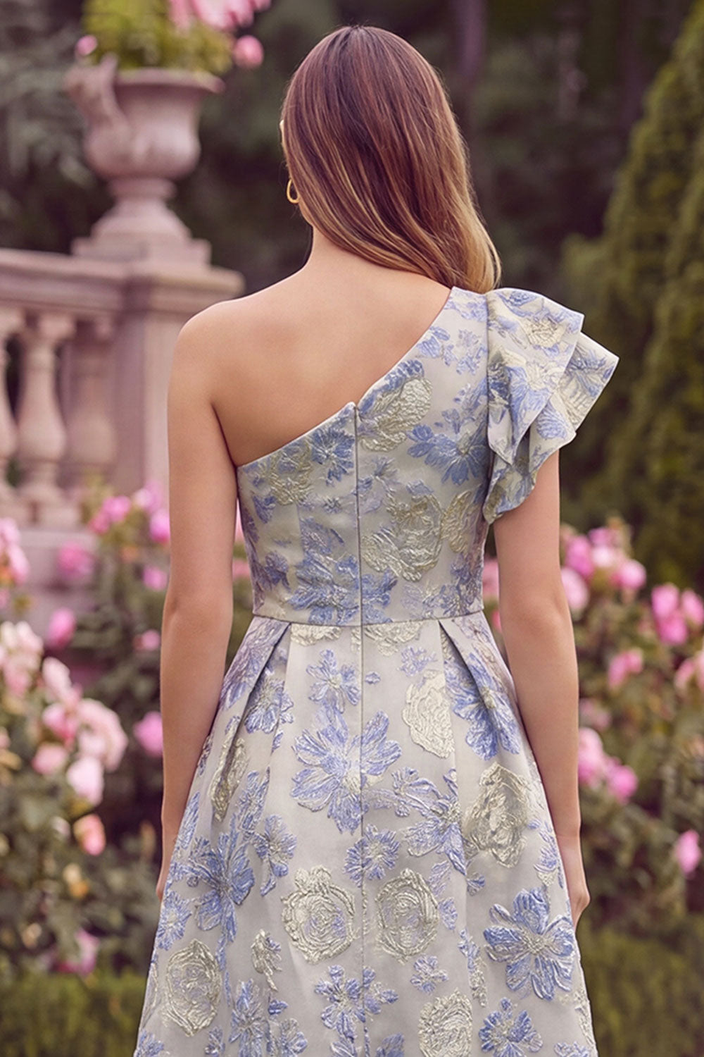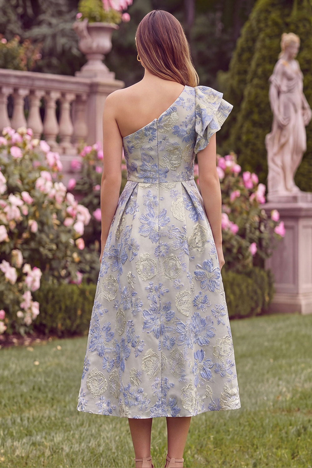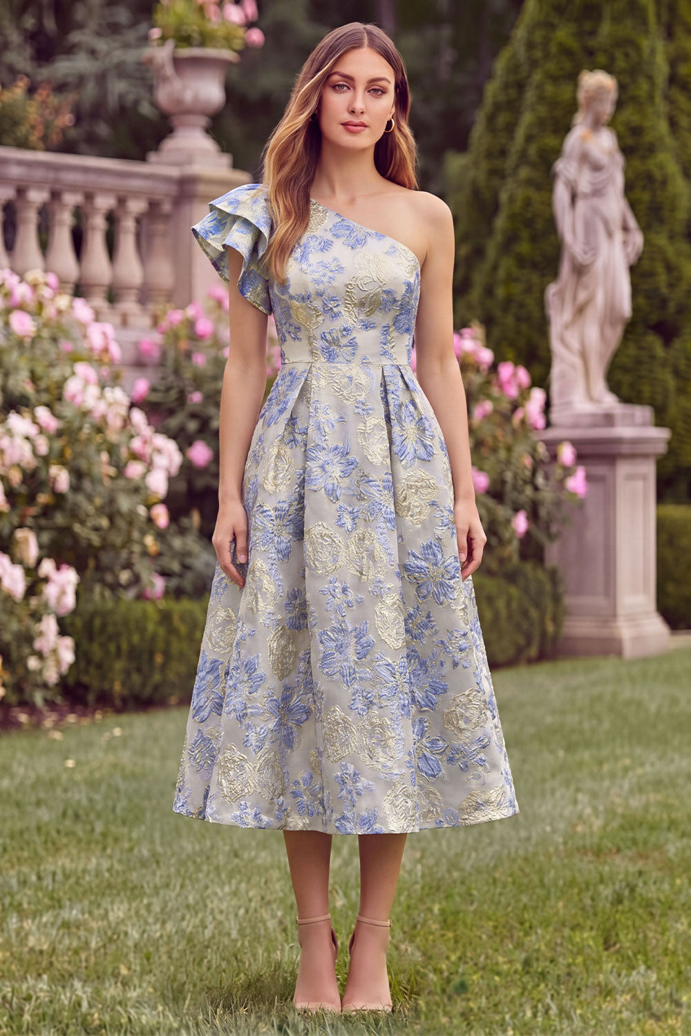 One Shoulder Light Blue Jacquard Midi Wedding Guest Dress