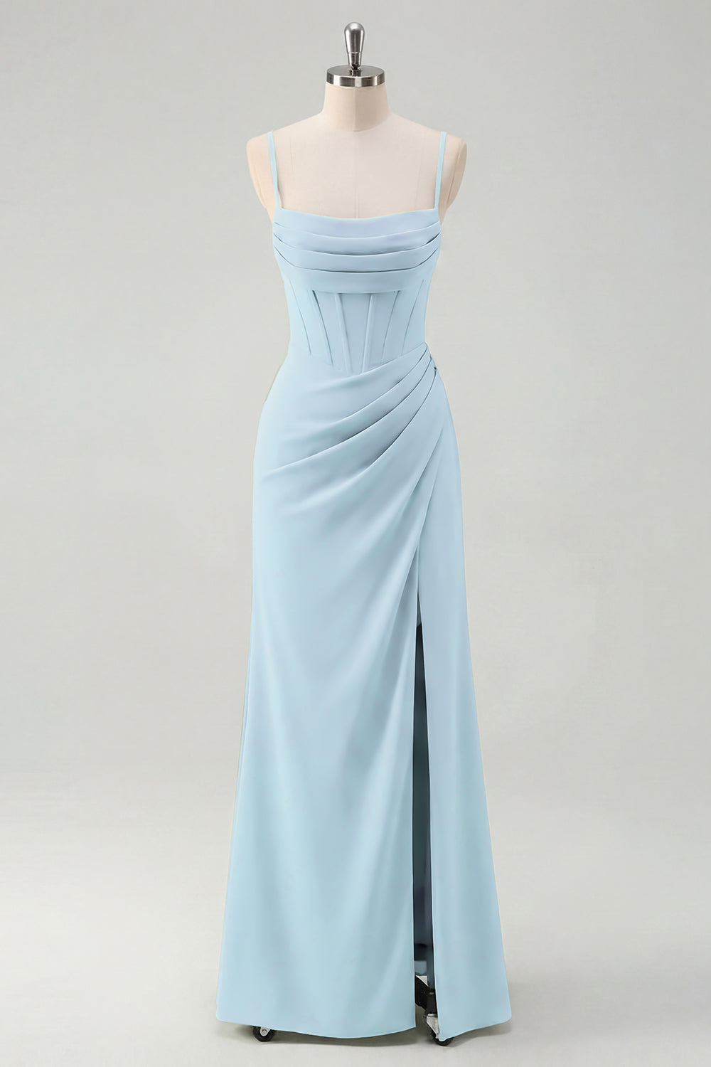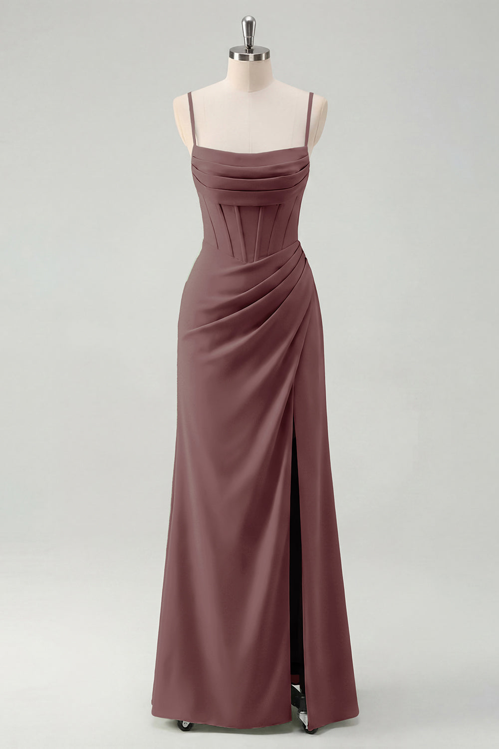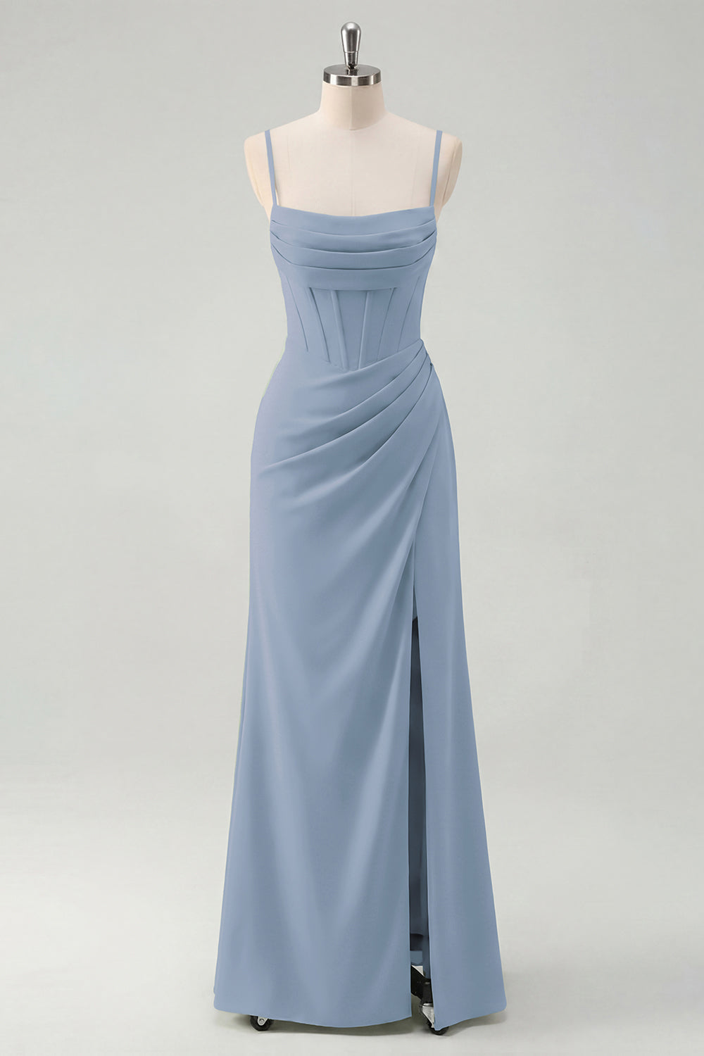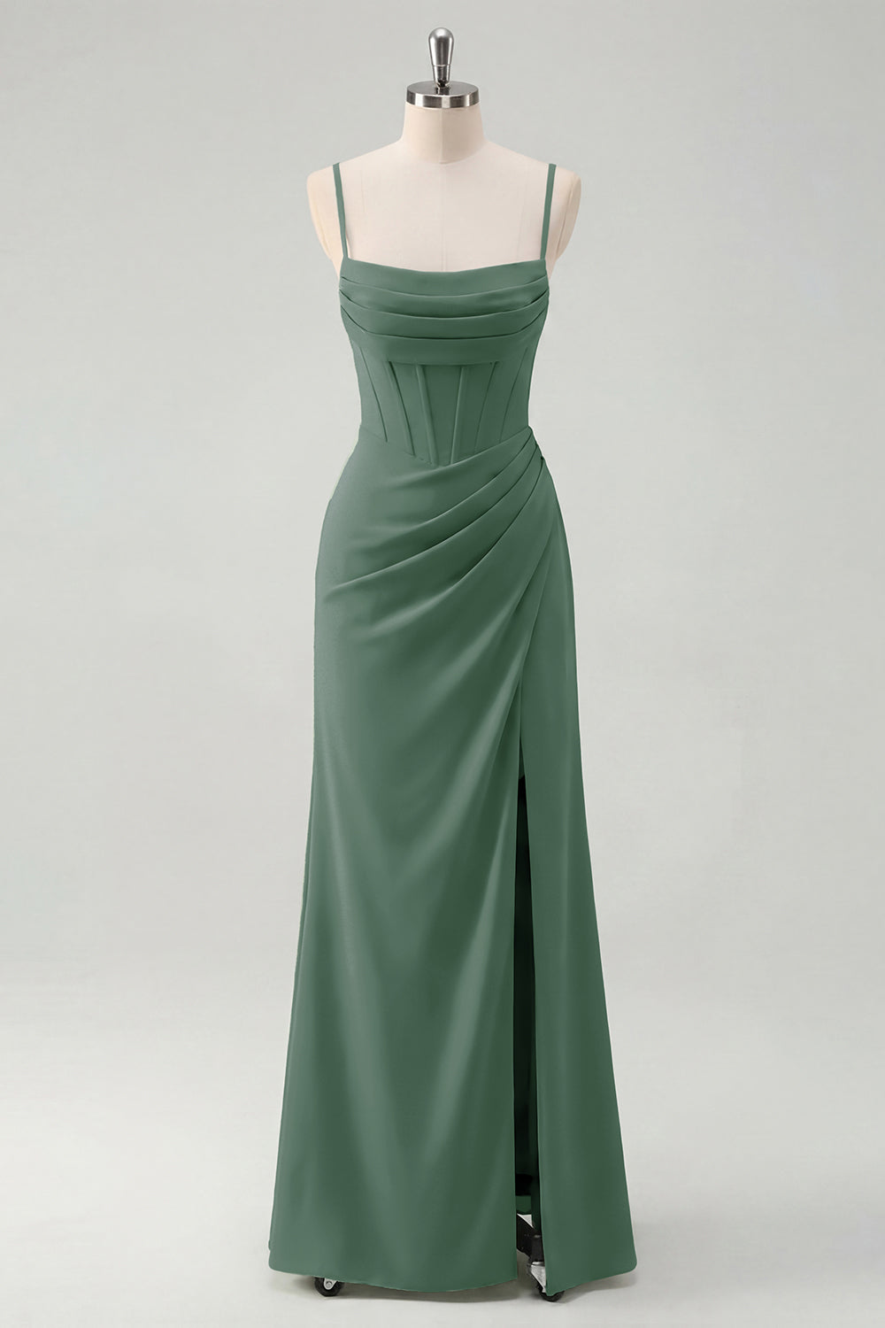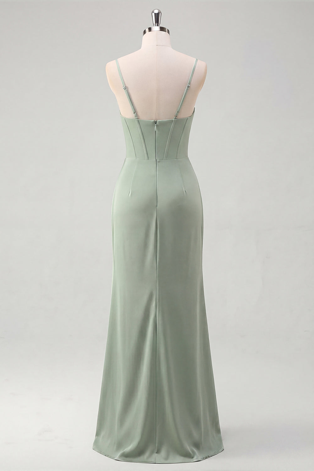 Sage Spaghetti Straps Sheath Bridesmaid Dress with Slit